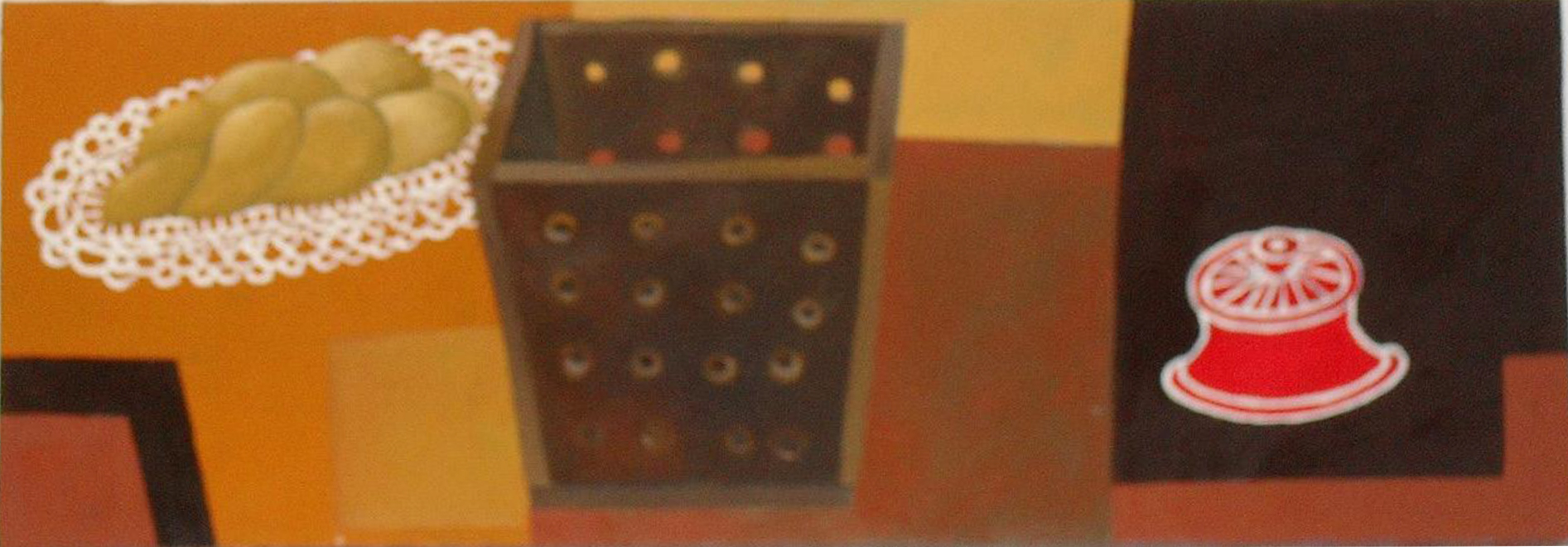 Senza titolo, natura morta con pane | Nathalie Du Pasquier | Marco | 1996 | Olio su tela con natura morta | 50x100 cm | Artista | completata |