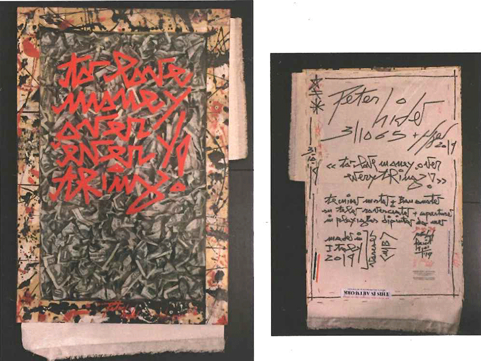 To love money over everything | Peter Hide | Marco | 43484 | Opera in tecnica mista e banconote (fac-simile) su tela con copertina in plexiglass, realizzata e dipinta dall'autore | 30x37x2.5 cm | Showcases Gallery (VA) | completata |